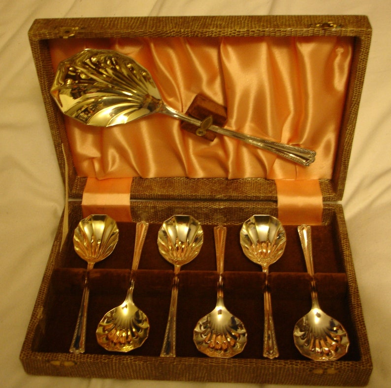 Circa 1940 Set Of Silver Plated Fruit Spoons With Server Made By